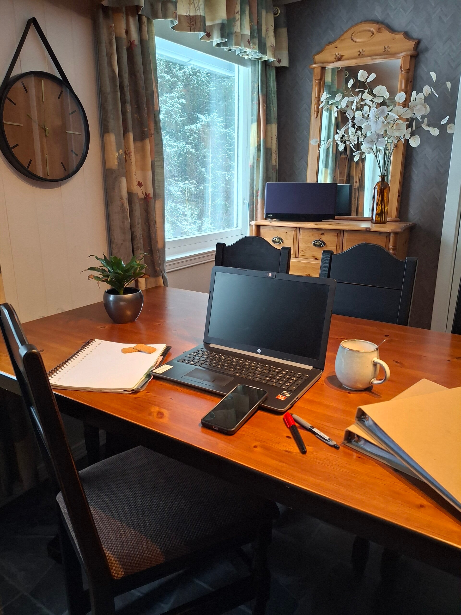 The spacious dining table functions well as a workstation.