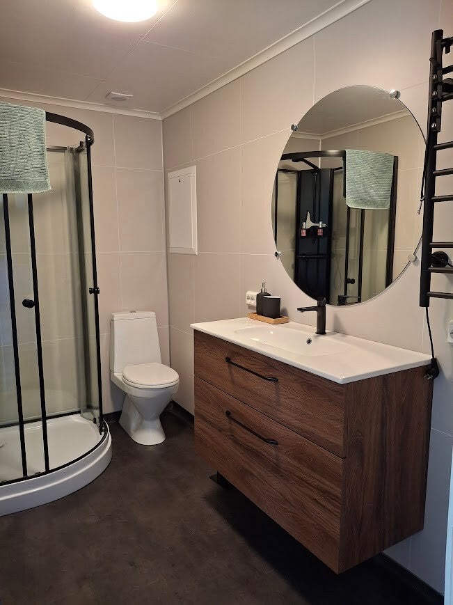 The bathroom is fully equipped and designed for comfort: